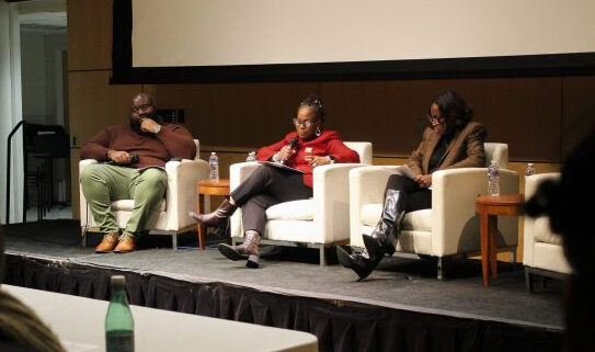 Tramon Lucas, president of the Baltimore Association of Black Journalists; Kaye Whitehead, Ph.D., of Loyola University Maryland; and Errin Haines, president of the National Association of Black Journalists, at a town hall BABJ held at the Reginald F. Lewis Museum. (Credit: Faith Spicer)