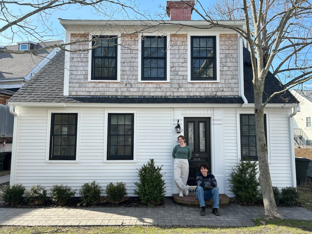 The Provincetown Independent’s Juliet Leary and Jack Styler in front of the three-bedroom condo in Provincetown, where they live with one other reporter. (Credit: Sonya Carson)