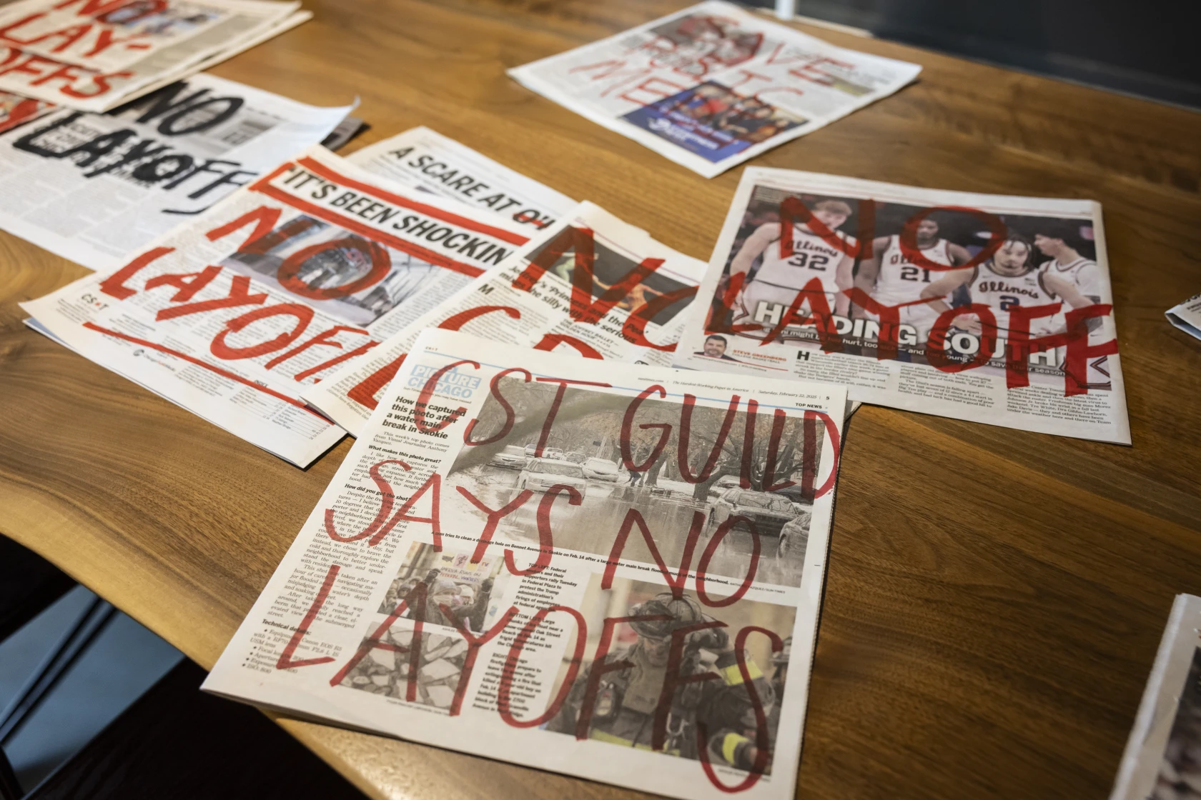 Homepage photo: Copies of the Chicago Sun-Times featuring slogans from the paper’s union protesting potential layoffs. (Credit:.Sun-Times Guild)