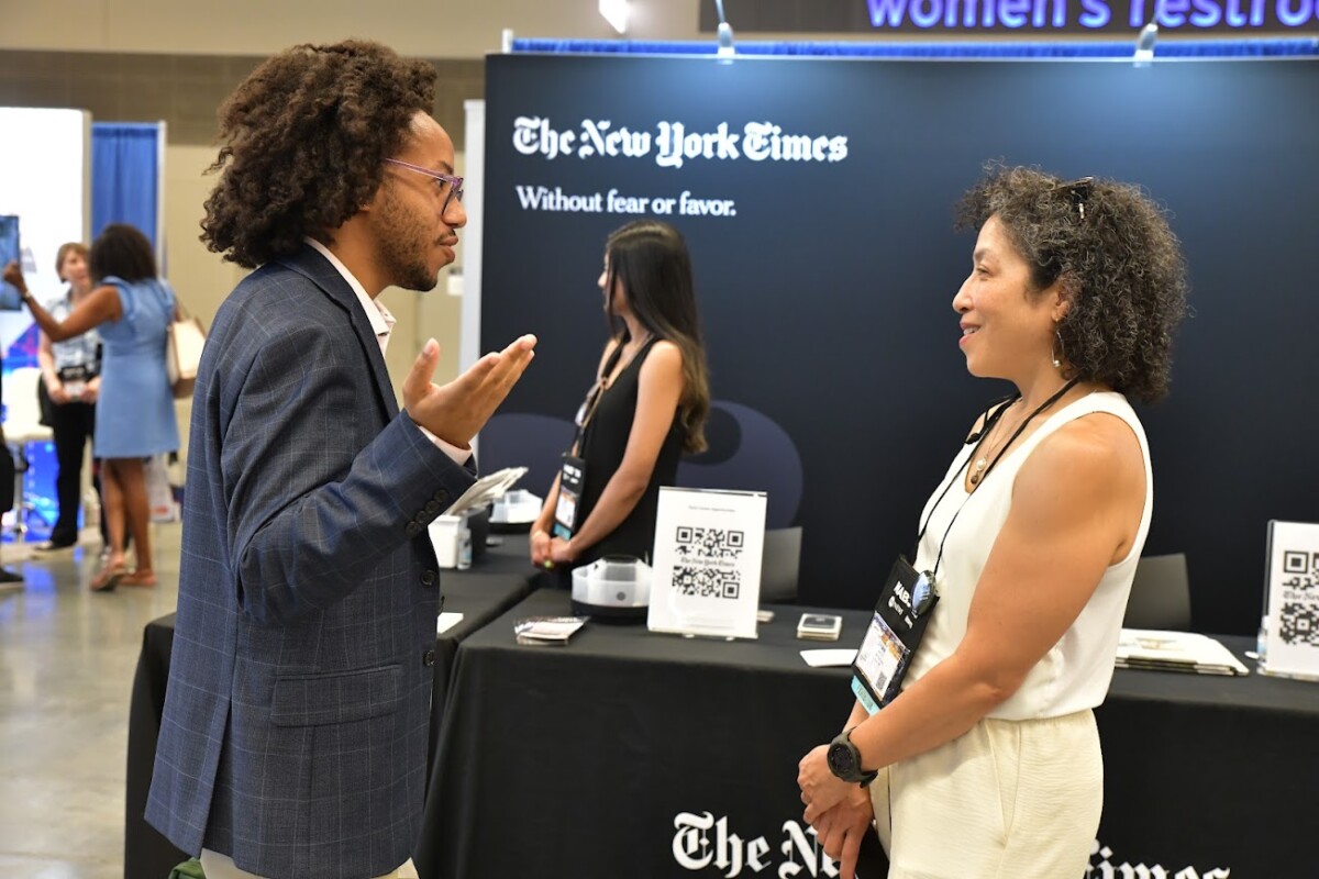 The New York Times booth at the August convention of the National Association of Black Journalists in Cleveland. In 2022, 51 news organizations exhibited at the joint convention of NABJ and the National Association of Hispanic Journalists. This year, just 34 newsrooms exhibited at the NABJ and NAHJ conferences. (Credit: NABJ)