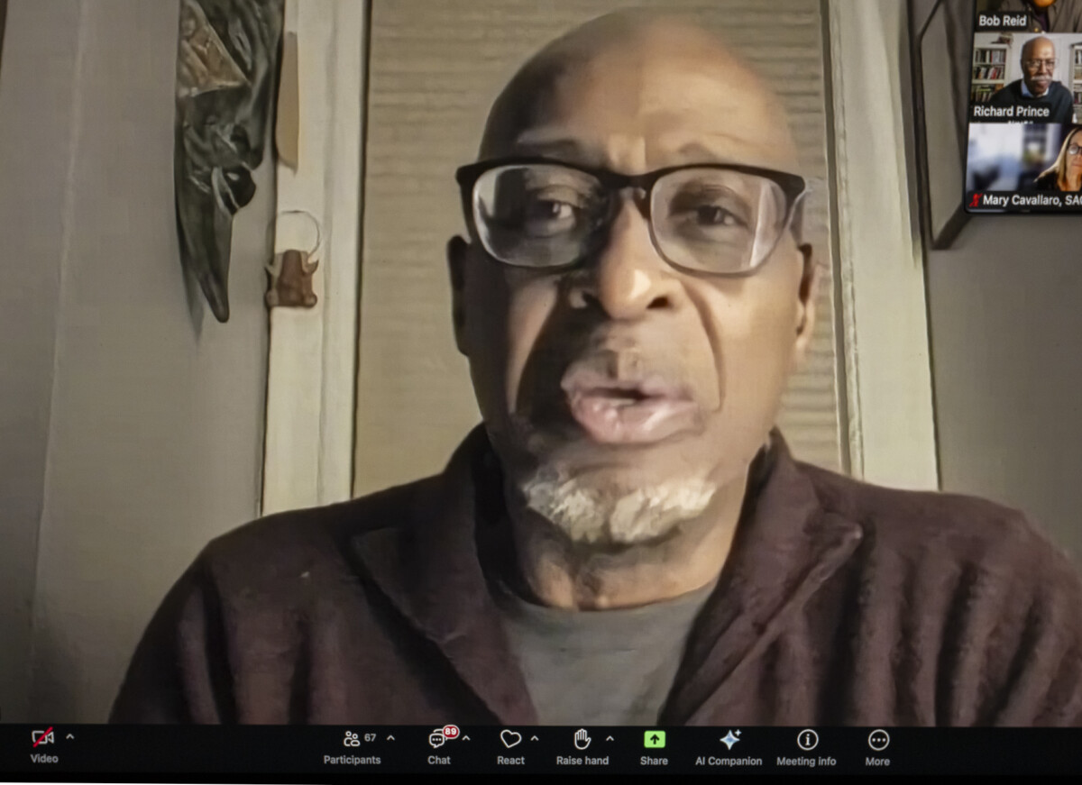 Phillip Martin, shown at the Journal-isms Roundtable three days after the cafe incident, noted that eyewitness misidentification and racial bias contribute to the disproportionate number of Black men in the criminal justice system. “It starts with something that’s innocent, as a misidentification at a counter in a restaurant or a café or a store. Once the police are involved, misidentification becomes a major, major issue,” Martin said. (Credit: Jeanine L. Cummins)