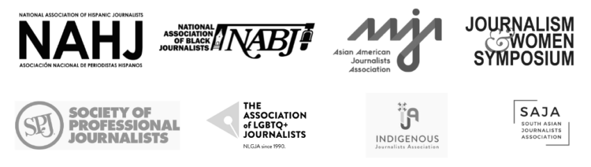 They are the Asian American Journalists Association, the Indigenous Journalists Association, Journalism & Women Symposium, known as JAWS, National Association of Black Journalists, the National Association of Hispanic Journalists, NLGJA: The Association of LGBTQ+ Journalists, the South Asian Journalists Association and the Society of Professional Journalists.