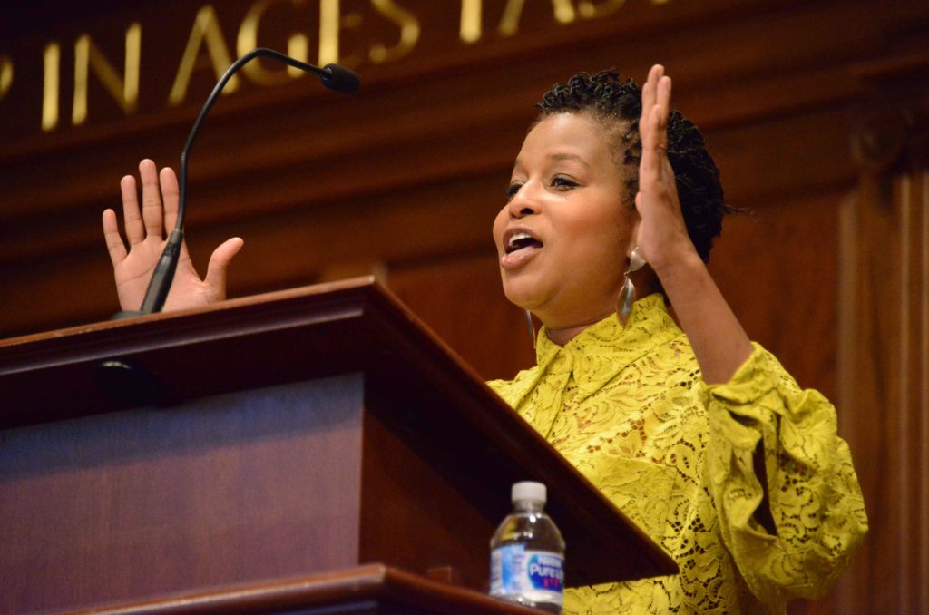 Nikita Stewart speaks in 2019 at the Roxbury Latin School n Boston, 400 years after the first enslaved people from Africa arrived in Virginia by boat. Stewart wrote one of the lead essays for The New York Times’ “1619 Project,” titled “Why Can’t We Teach This?” (Credit: Roxbury Latin School)