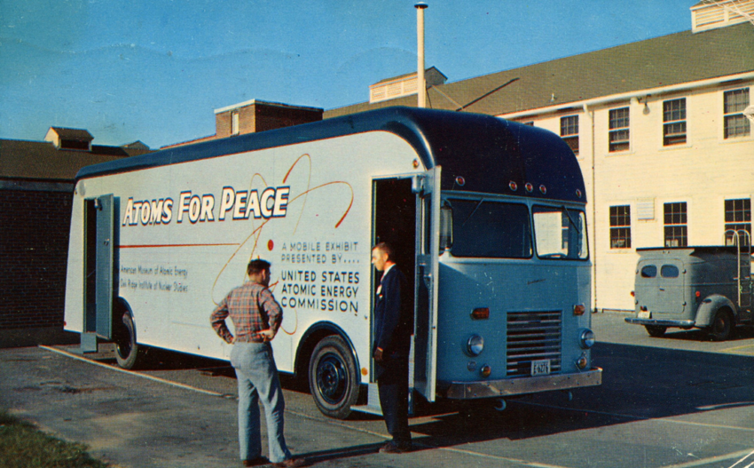 “Regardless, it set in process the three main aims of the Atoms for Peace program, as embodied in its seal: advancements in industry, in medicine, and in agriculture. The latter led directly to the funding and development of ‘gamma gardens’ at the US national laboratories that had only lately been used to develop the atom bomb. It also launched a public relations program that sought to educate American citizens about ‘Atoms for Peace’ via posters, newsreels, and traveling road shows. . . . ”