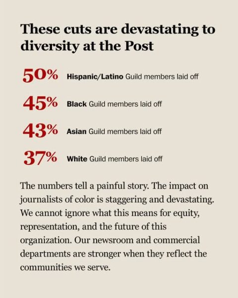 “The numbers tell a painful story. The impact on journalists of color is staggering and devastating,” the Post Guild said in its statement. “We cannot ignore what this means for equity, representation, and the future of this organization. Our newsroom and commercial departments are stronger when they reflect the communities we serve.”
