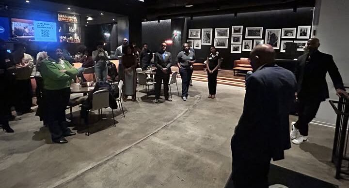 Top photo: A noontime Guild rally in front of the Washington Post building on Feb. 5 attracted relatively few community members of color (Credit: Richard Prince). But on Tuesday, members of the Washington Association of Black Journalists heard Terence Samuel, a former Post journalist and a veteran who told the group he had been fired as top editor at USA Today, tell a WABJ happy hour to keep their heads up and press on. (Bottom photo, credit: WABJ)