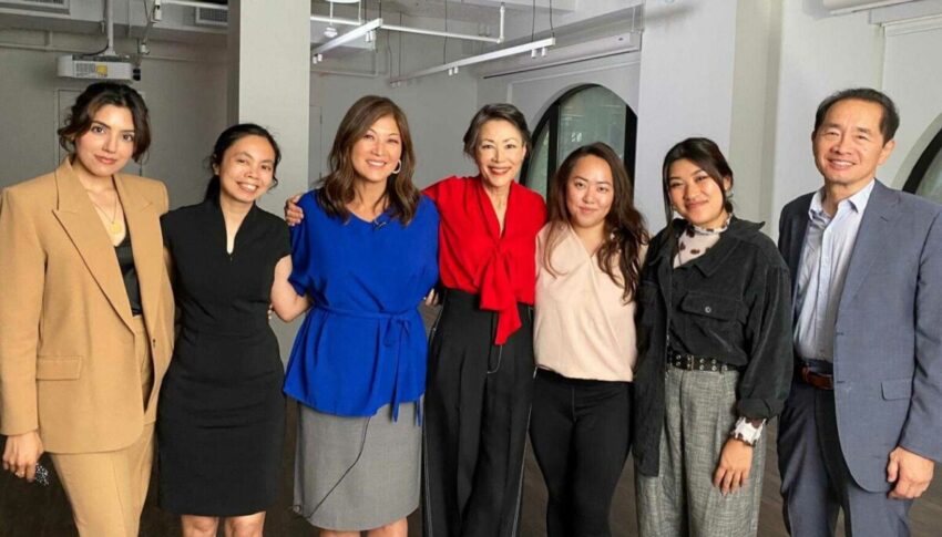Ann Curry, in red, is flanked by, from left, fellow journalists Zinnia Bukhari, Leezel Tanglao, Juju Chang, Jessica Xiao, Sofia Koyama and Ti-Hua Chang at the China Institute in New York on July 29, 2021. (Credit: Asian American Journalists Association.)