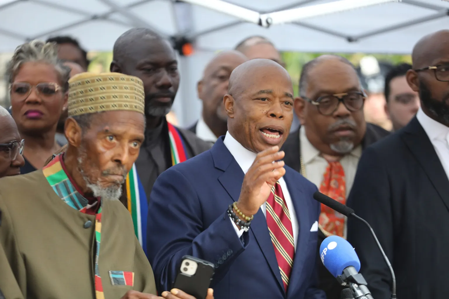 New York Mayor Eric Adams, standing in September 2024 with the Rev. Herbert Daughtry outside Gracie Mansion, vowed to fight federal bribery and other charges. (Credit: Alex Krales/The City)