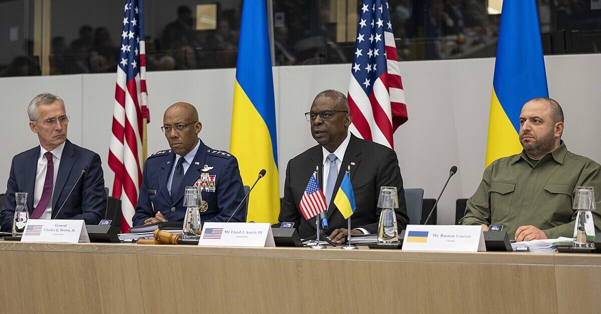 Lloyd Austin, third from left, was secretary of defense when this photo was taken in 2024. Austin sits next to Gen. Charles Q. Brown Jr., chairman of the Joint Chiefs of Staff, at a Ukraine Defense Contract Group meeting in Brussels, Belgium. Austin resigned when the Trump administration took office, and President Trump promptly fired Brown as too “woke.” It was unprecedented for two Black men to hold these top two military positions simultaneously. They are flanked by NATO Secretary General Jens Stoltenberg, left, and Rustem Umerov of Ukraine. (Credit: Department of Defense)
