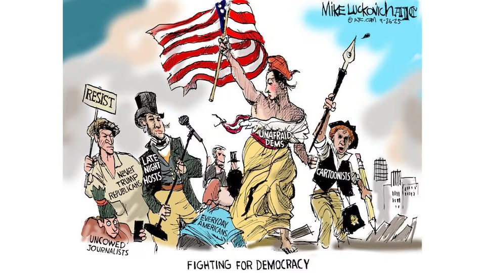 Mike Luckovich of the Atlanta Journal-Constitution believes that “uncowed journalists” — and cartoonists — are among those fighting for democracy. (Credit: Mike Luckovich of the Atlanta Journal-Constitution.)