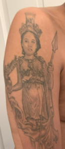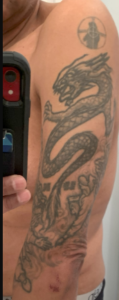 “Harold has several tattoos, On right arm a black and white tattoo of a young female (his daughter) wearing a dress with a spear on left hand wearing a crown. Left arm a black and white tattoo of a dragon, and above a black and white tattoo of a firearm scope with a black silhouette in a circle (Public Enemy symbol). Inner left elbow area a black and white ninja male/bear in a karate GI.”